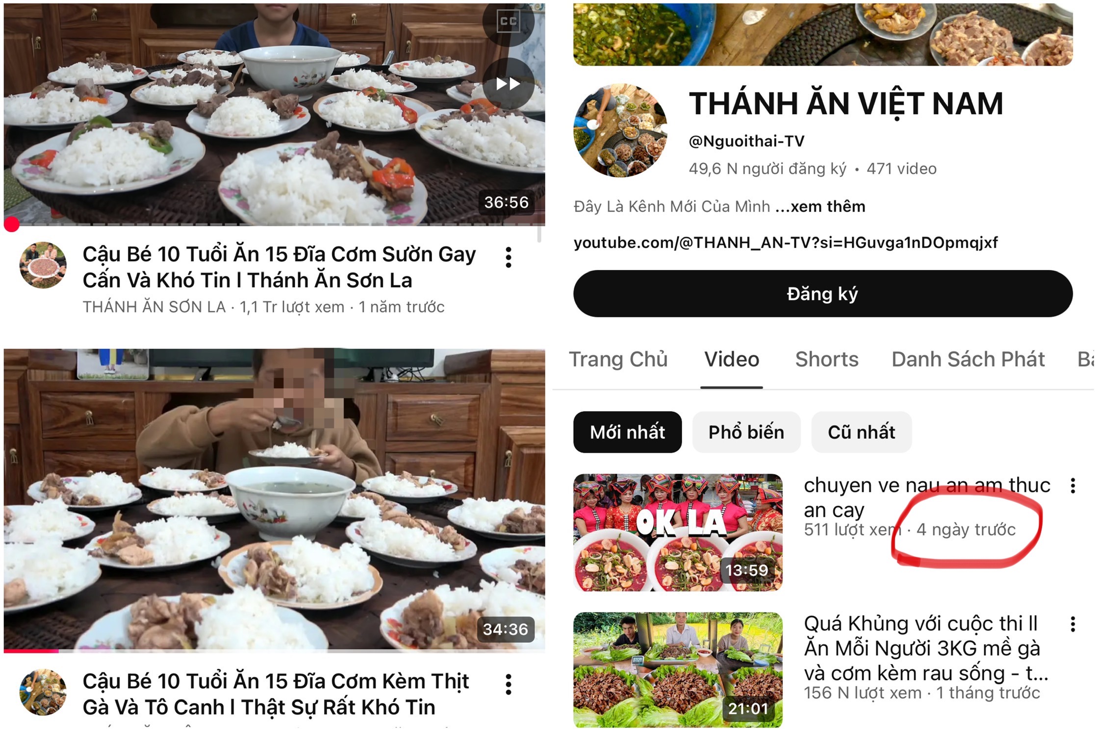 Nhiều video ghi cảnh trẻ em khoảng 10 tuổi phải ăn 15 đĩa cơm, 30 quả trứng vịt lộn, 10 gói mì tôm… trong vòng 20 phút. Các tiêu đề đều được đặt theo hướng gây sốc như “rùng mình”, “kinh hoàng”, “không tin nổi” nhằm thu hút lượt xem và kiếm tiền từ YouTube.